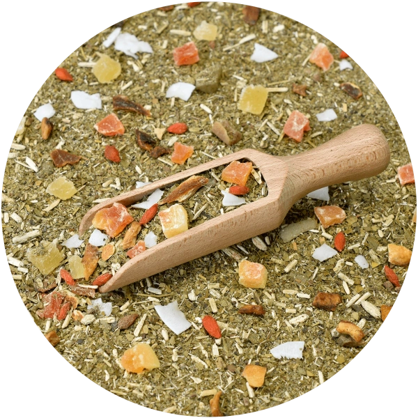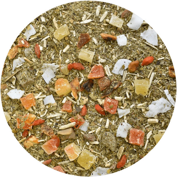Guarani Exotic Rain Guarani Exotic Rain vous emmène littéralement sur une île tropicale ! La saveur caractéristique et intense de la yerba mate séchée au feu et à la fumée se combine étonnamment bien avec des ingrédients exotiques : baies de goji légèrement acidulées, morceaux de mangue séchée, morceaux sucrés d'ananas et de papaye confits et écorces d'orange acidulées. De gros flocons de noix de coco blanche ajoutent une douceur délicate et une profondeur éthérée. C'est une excellente option pour les amateurs de fusions originales. Hautement recommandé
